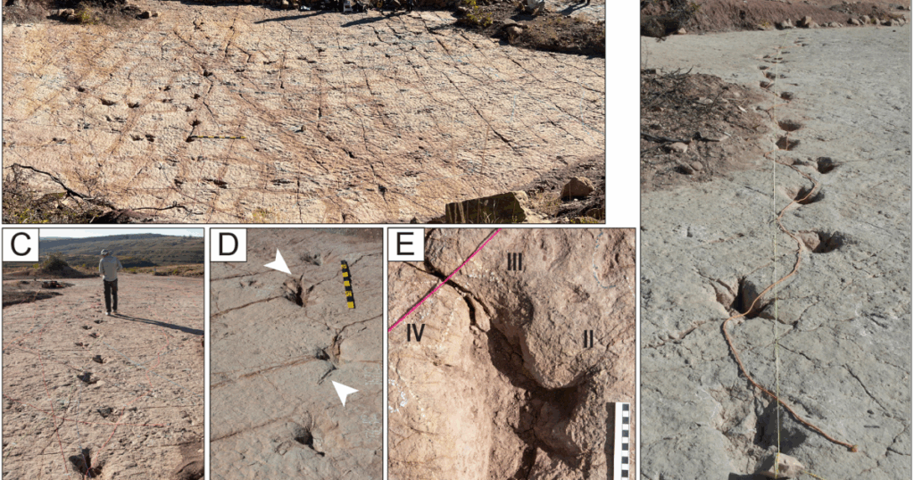 Curiously, among the footprints comprise small “rosette” burrows made later by invertebrates tunneling by the drying mud. As a result of these burrows sit contained in the dinosaur tracks, they verify the prints are real floor impressions fairly than deeper tracks created by strain alone.