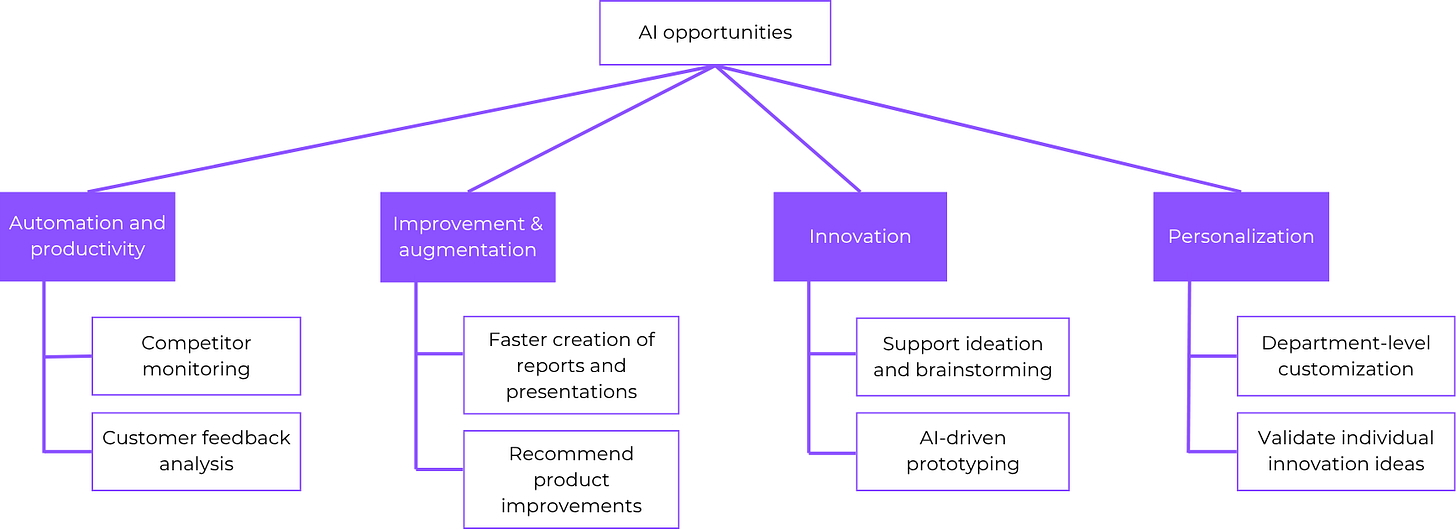 When ideating, you need to attempt to construct a wealthy area of concepts by gathering a number of alternatives for every profit. It will end in a structured AI Opportunity Tree. Here’s a small a part of the chance tree we constructed within the automotive state of affairs: