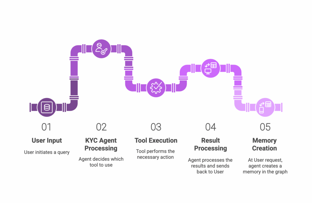 The diagram beneath illustrates the agent processing pipeline to reply questions raised throughout a KYC investigation.