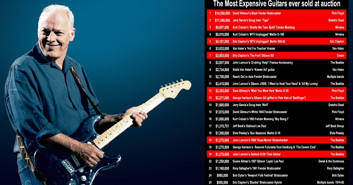The largest information was the return of Dave Gilmour’s “Black Strat” to the highest of the heavyweight guitar value rankings, with a value of $14,550,000 – Irsay bought the Fender Stratocaster in 2019 for what was then a world-record $3,975,000. Since then, the costs of elite collectible guitars have skyrocketed.