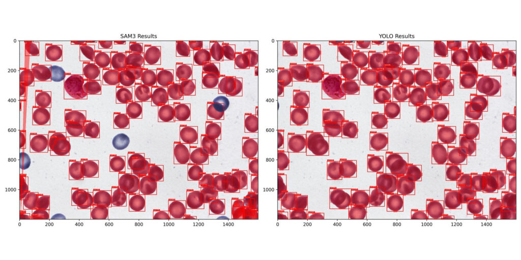 Regardless of my preliminary perception that this could be a win for SAM3 the specialist mannequin once more outperformed the muse mannequin by 23.59% total. Even when the visible guidelines appear to favor a generalist the specialised coaching permits the smaller mannequin to seize the area particular nuances that SAM3 misses. You may see from the outcomes above SAM3 is lacking various cases of cells.