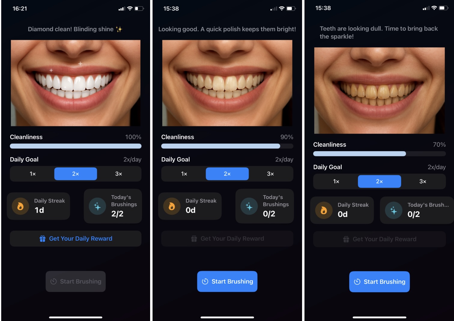 If the consumer completes all brushings in a day, she will get a vivid inexperienced. In case of partial completion, the sq. for that day is coloured with pale inexperienced. The opposite days are proven in black and the present day is indicated with a white body.